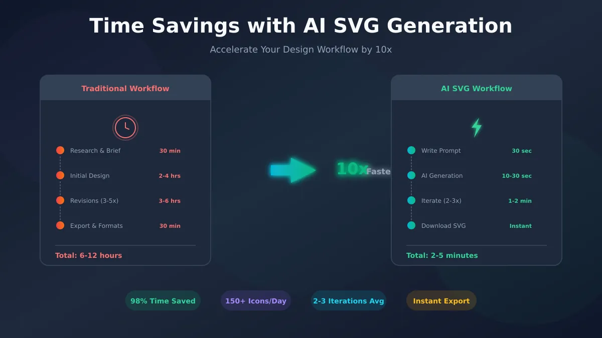 This guide breaks down exactly how AI-powered SVG generation transforms design workflows, with real metrics, practical optimization strategies, and frameworks for measuring your own time savings. Whether you're a solo founder, a designer on deadline, or a team lead optimizing creative operations, understanding these time dynamics is essential for modern design work.
